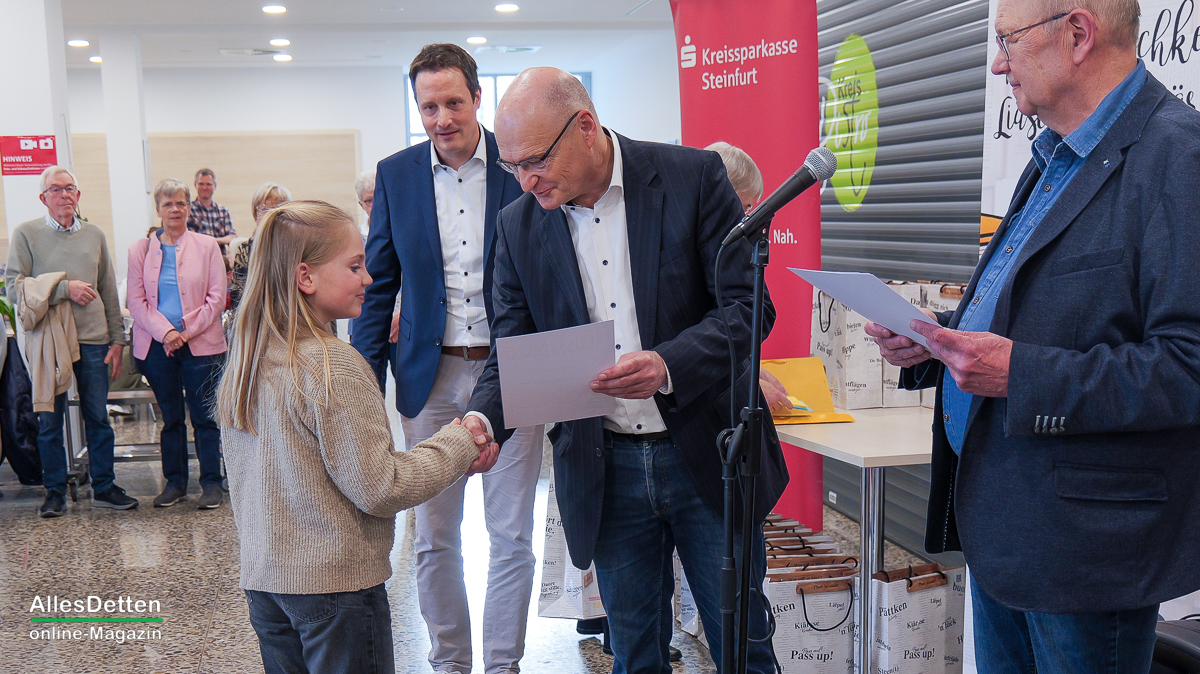 Aus Emsdetten waren Wilma Feldmann von der Wilhelmschule und Marie Spieker von der Käthe-Kollwitz-Schule erfolgreich angetreten. Die Urkunden, die sie mit Glückwünschen vom Landrat erhielten, dürften mittlerweile stolz an den Wänden hängen. Beide haben ihre Heimatstadt und das Dettske Platt hervorragend vertreten! Für die unabhängige Jury dürfte die größte Aufgabe tatsächlich darin gelegen haben, die unterschiedlichen Texte (jeder Teilnehmer hatte einen eigenen) miteinander zu vergleichen und tatsächlich wurde auch hier bereits deutlich, dass selbst im eigentlich überschaubaren Kreis Steinfurt in den einzelnen Städten und Gemeinden unterschiedliche Begriffe und Aussprachen für die selben Dinge gebräuchlich sind.
